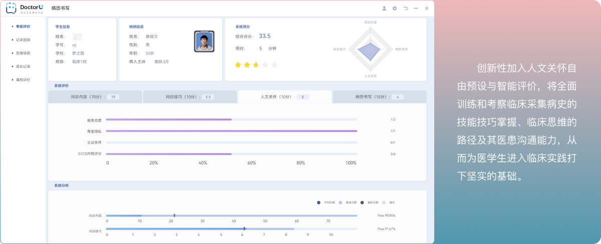 基于人工智能大语言模型DoctorU®开发的病史采集技能实践教学系统,以诊断学教学大纲和OSCE全国执业医师考试实践技能的评分方式及评分标准为教学内容,支持在线实践学习、技能进阶训练与考试、标准化病人实践学习辅助评价等教学应用场景与功能。